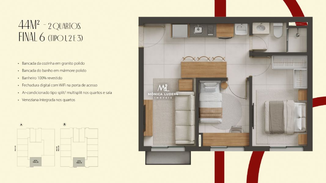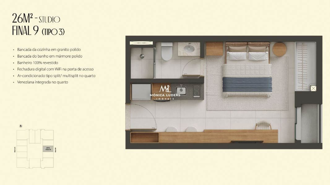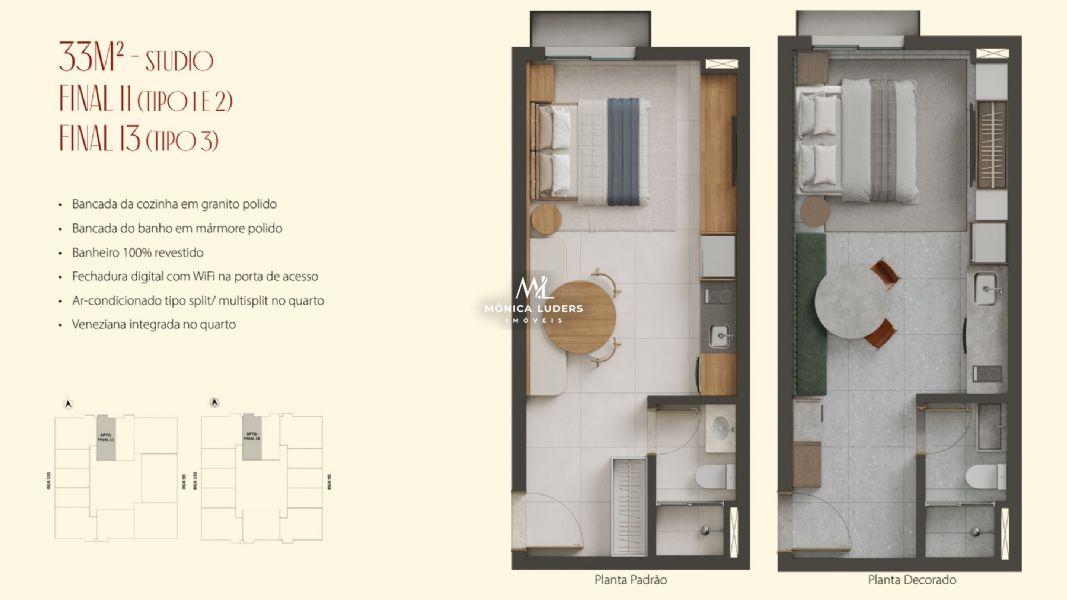 Detalhes: Studios de 26 a 33m, Studios e Aptos 2 e 3 quartos e Duplex